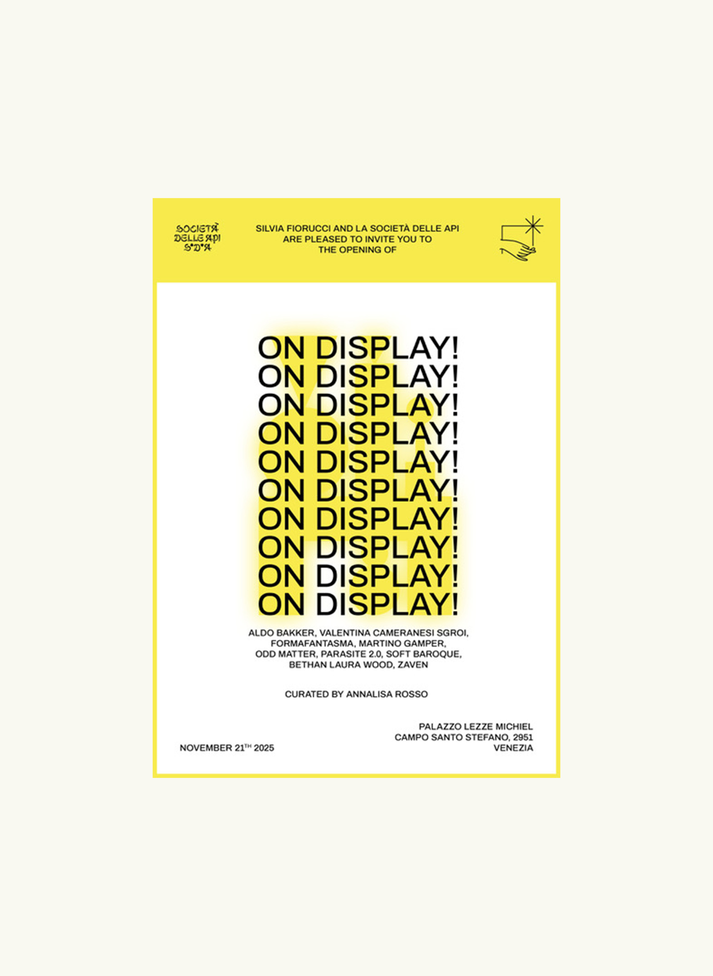 La Società delle Api presents the exhibition ON DISPLAY! curated by Annalisa Rosso and featuring nine international designers and design studios. Aldo Bakker, Valentina Cameranesi Sgroi, Formafantasma, Martino Gamper, Odd Matter, Parasite 2.0, Soft Baroque, Bethan Laura Wood, and Zaven have been invited to Palazzo Lezze Michiel—the Venetian home of Silvia Fiorucci, founder and president of La Società delle Api—to reflect on the theme of the display as an interpretative act, one which is never neutral, designed to guide both perception and meaning.